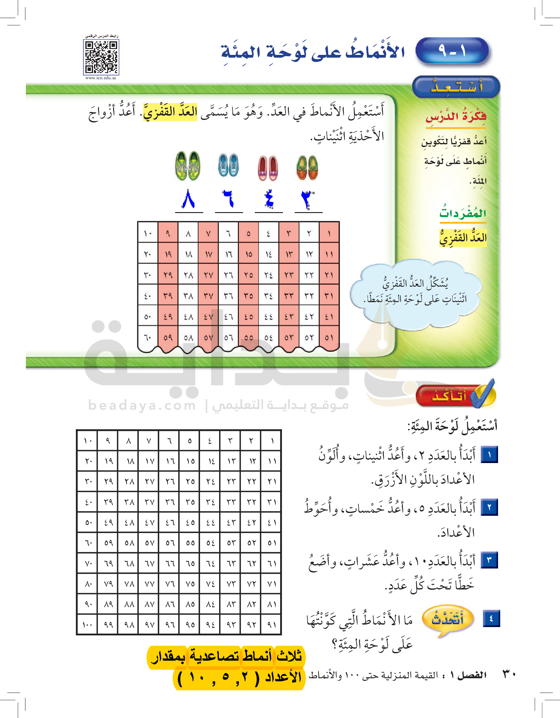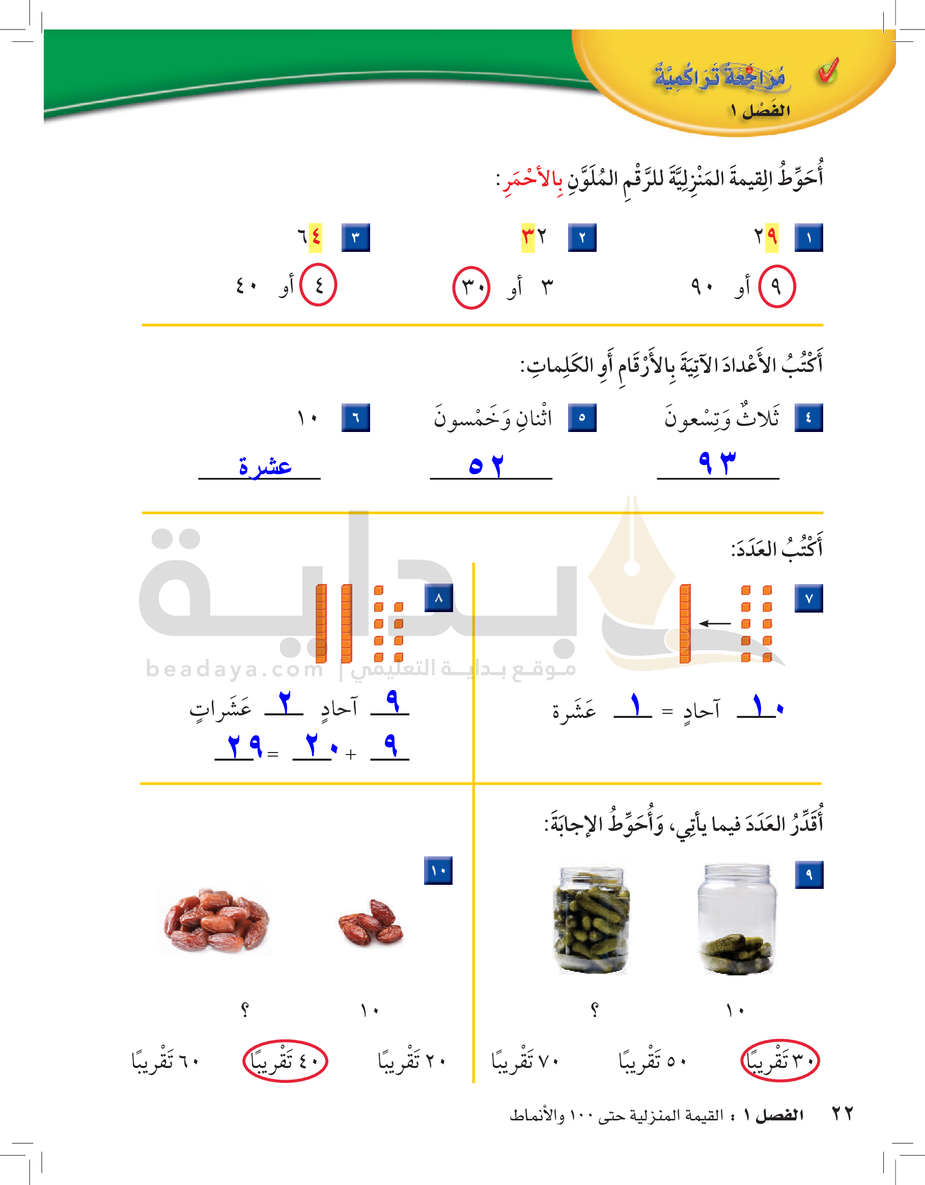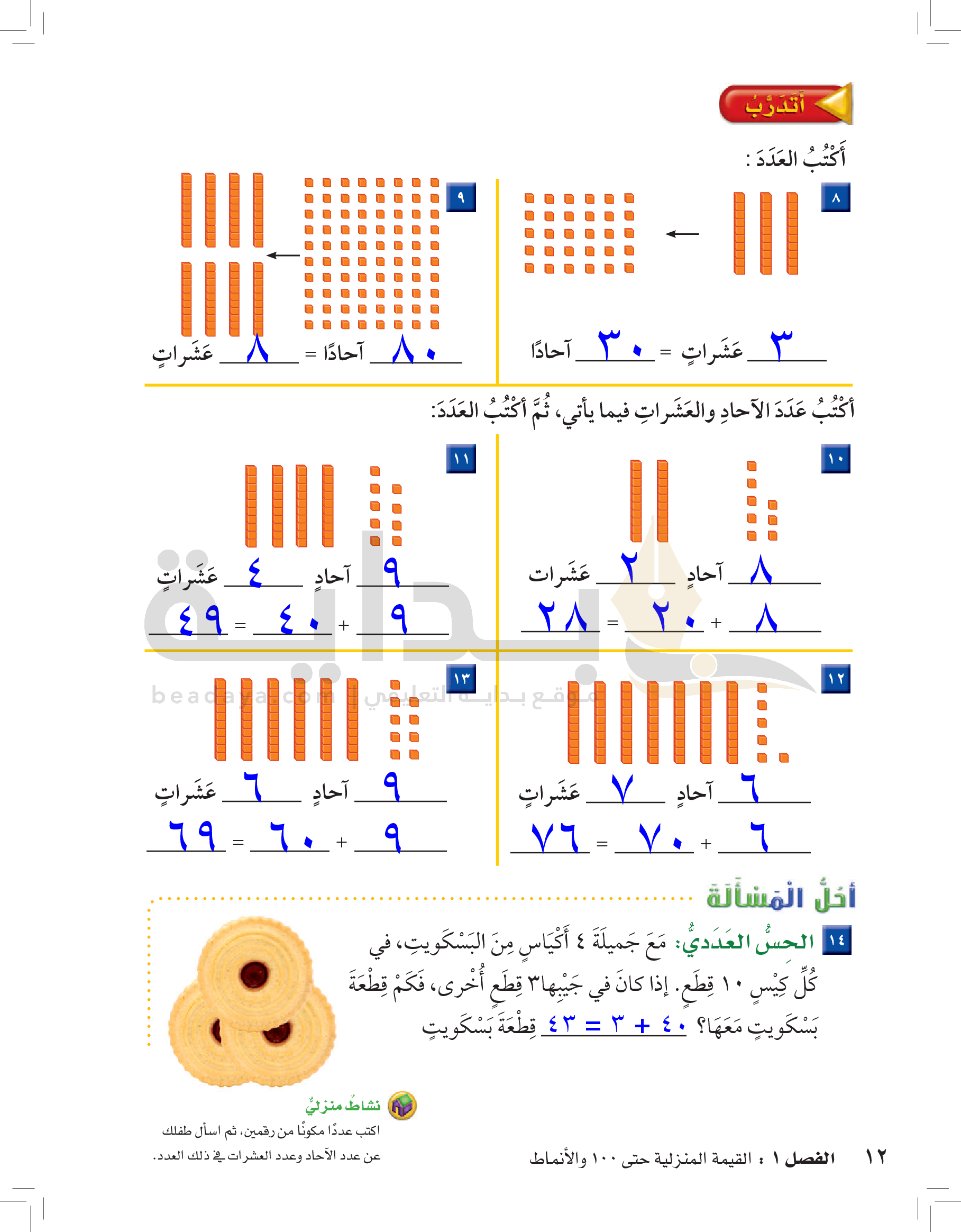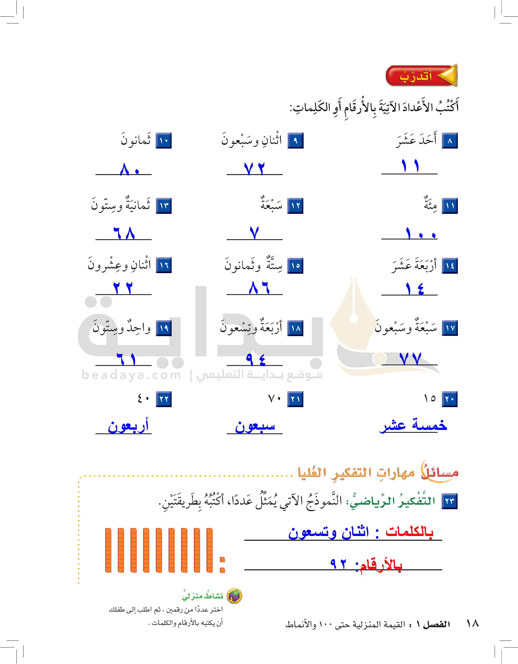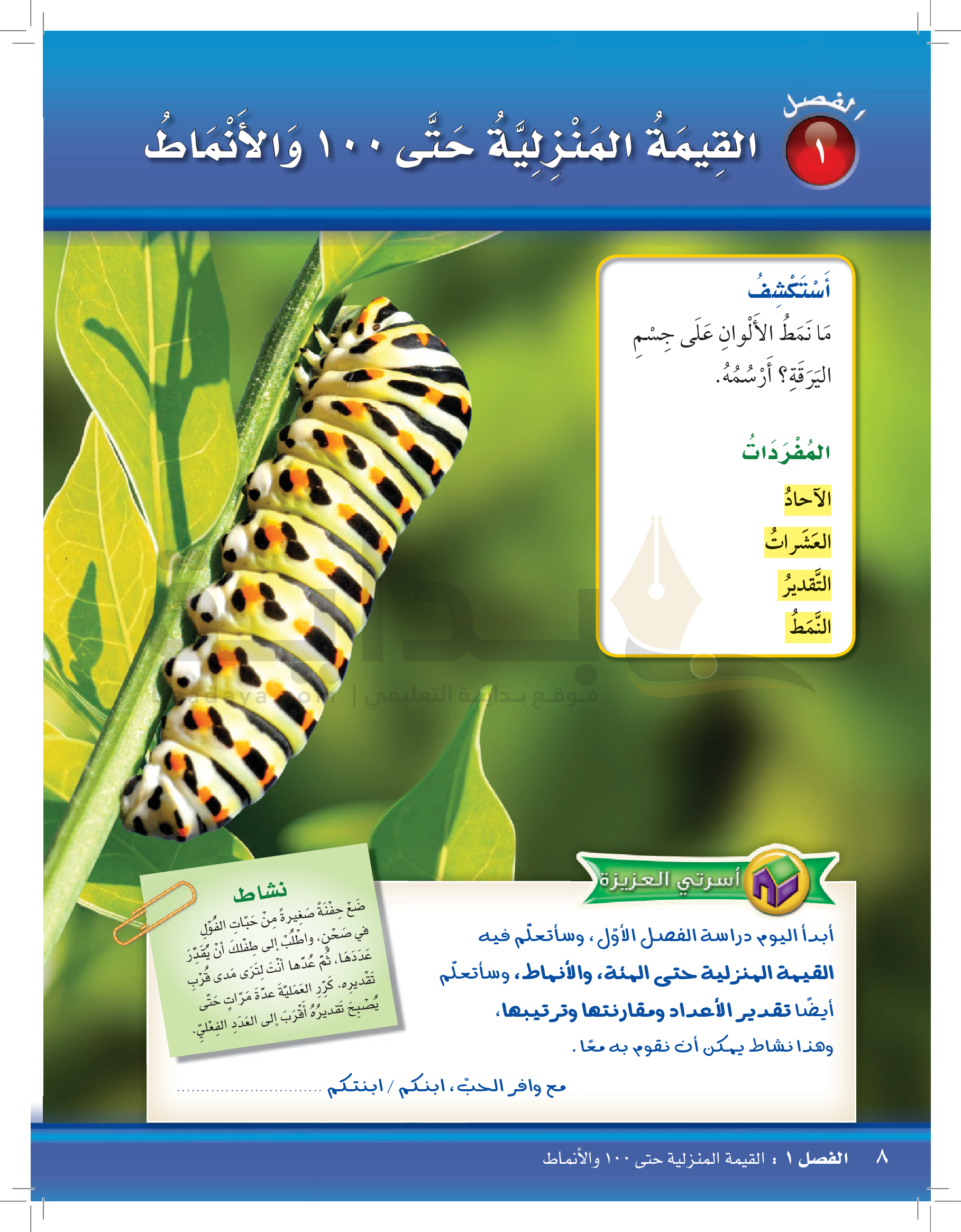 الفصل الأول: القيمة المنزلية حتى 100 والأنماط