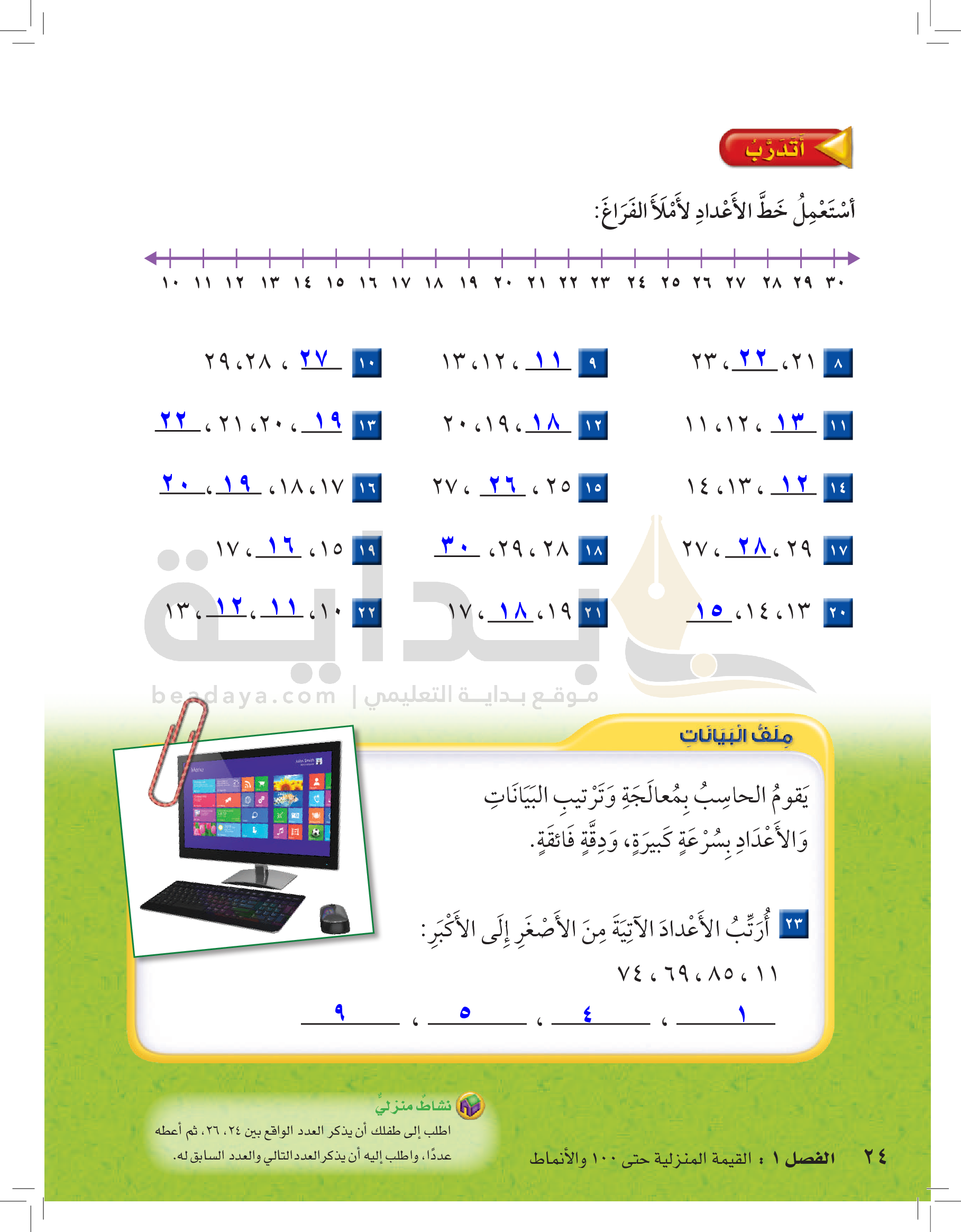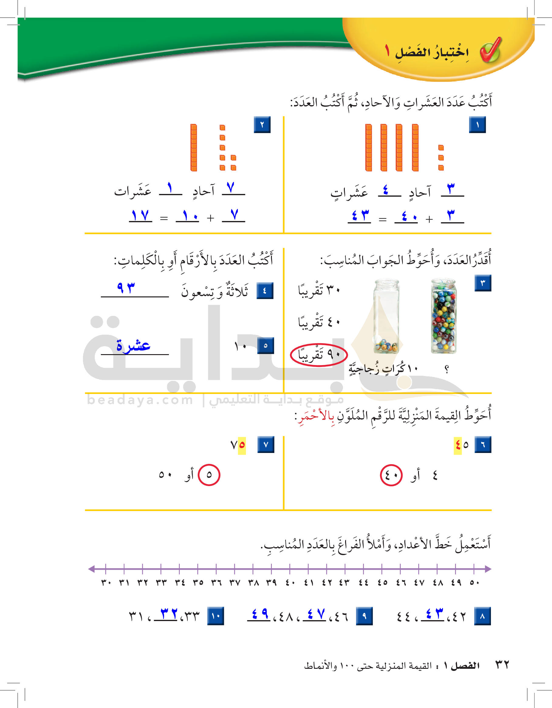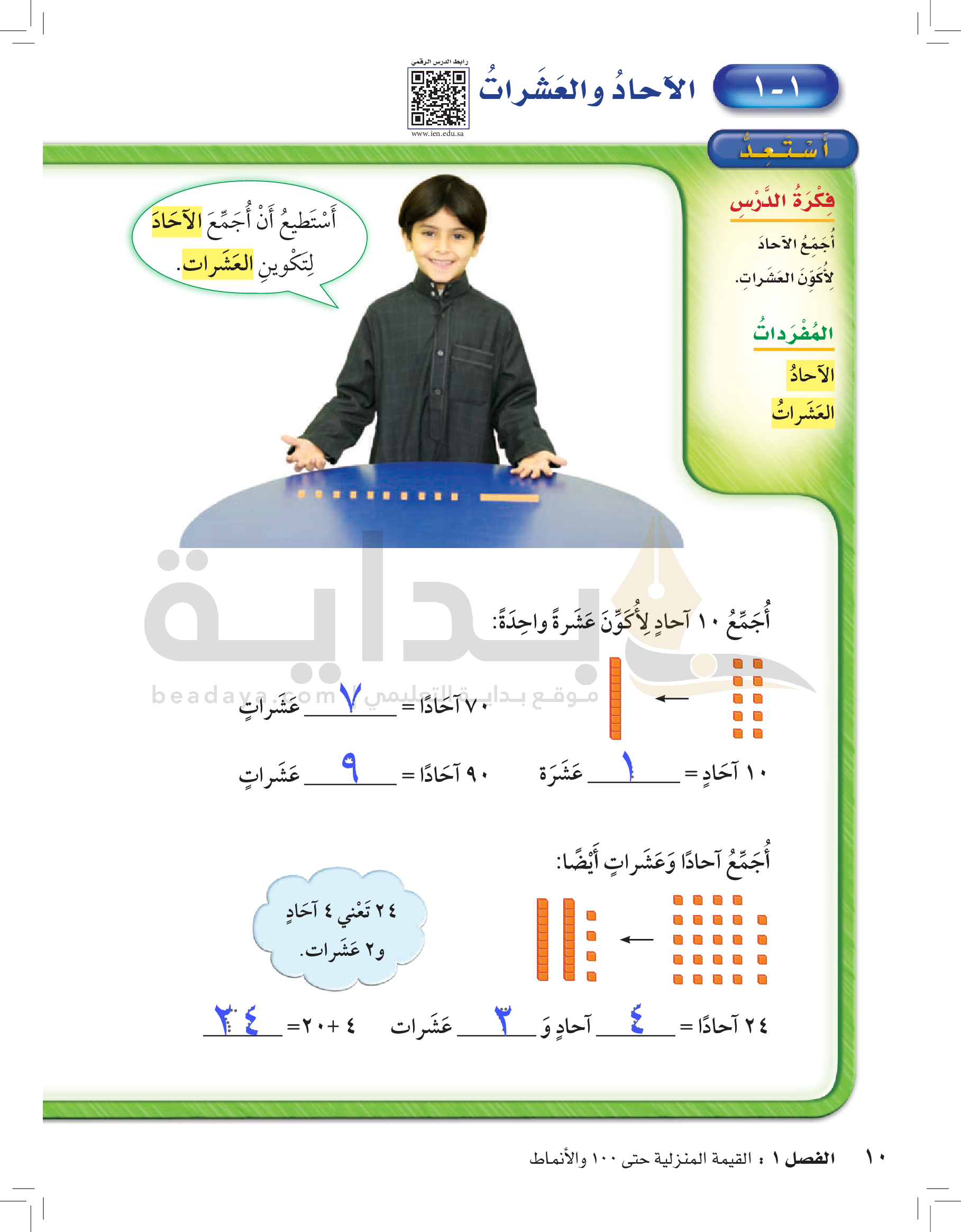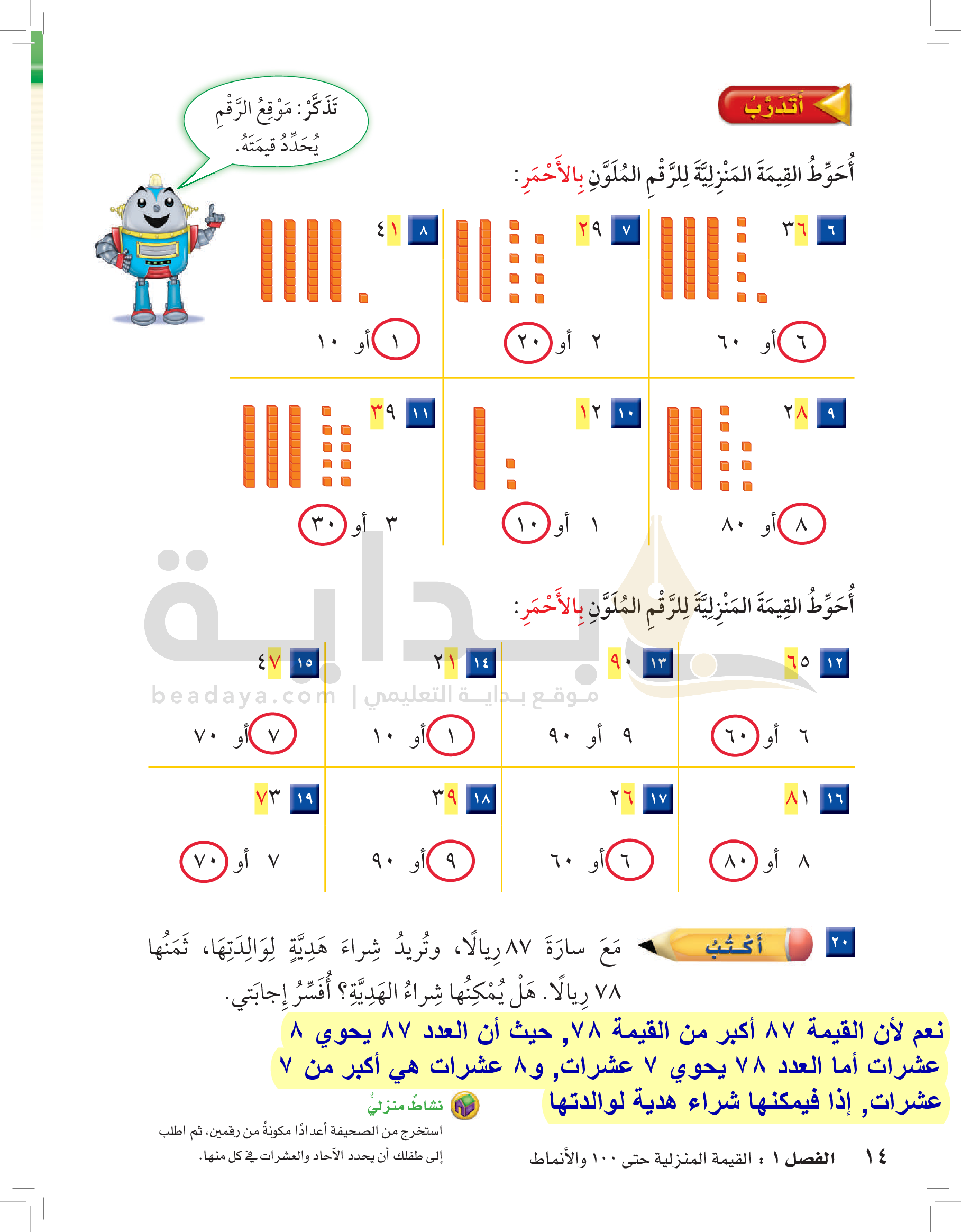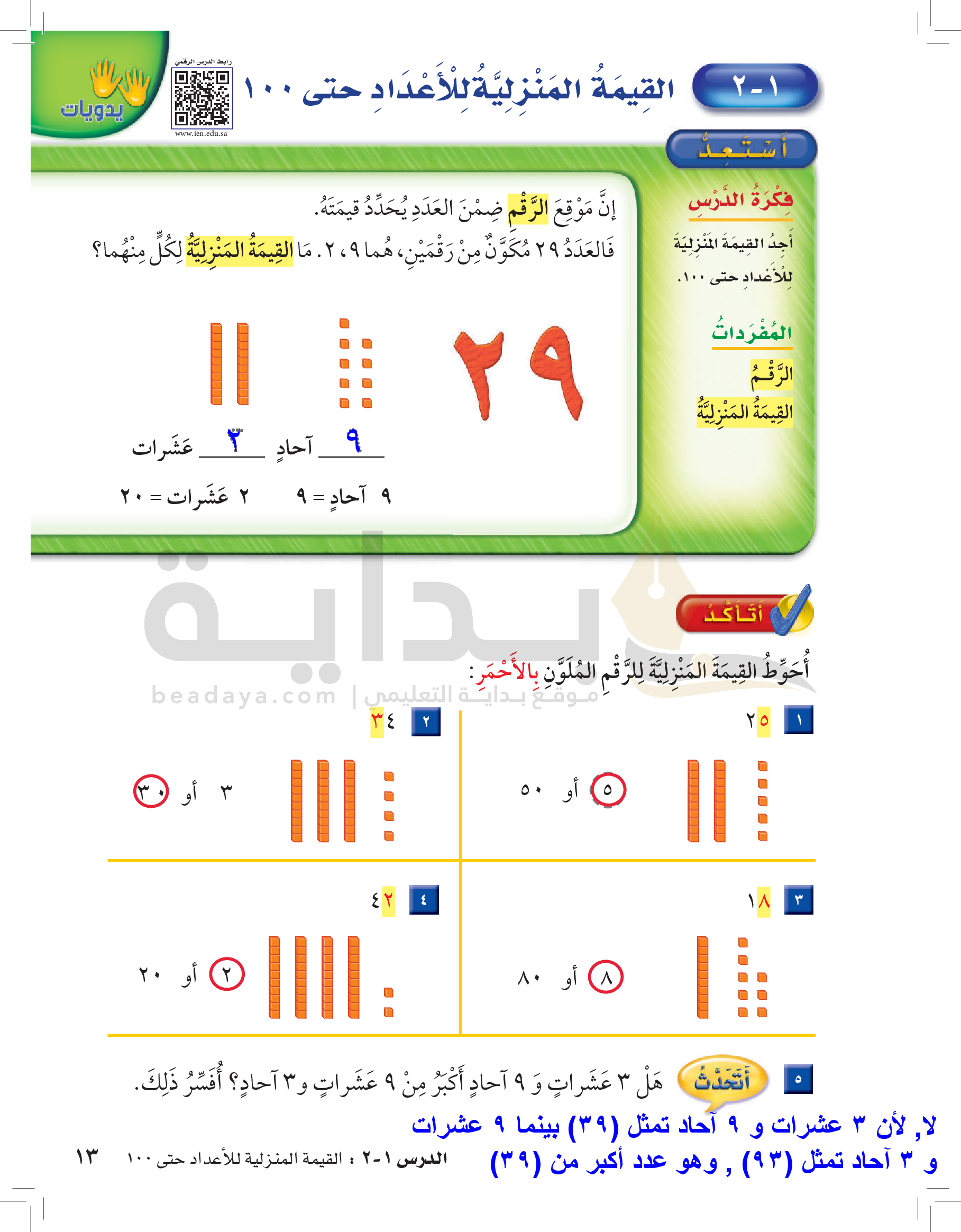 الفصل الأول: القيمة المنزلية حتى 100 والأنماط