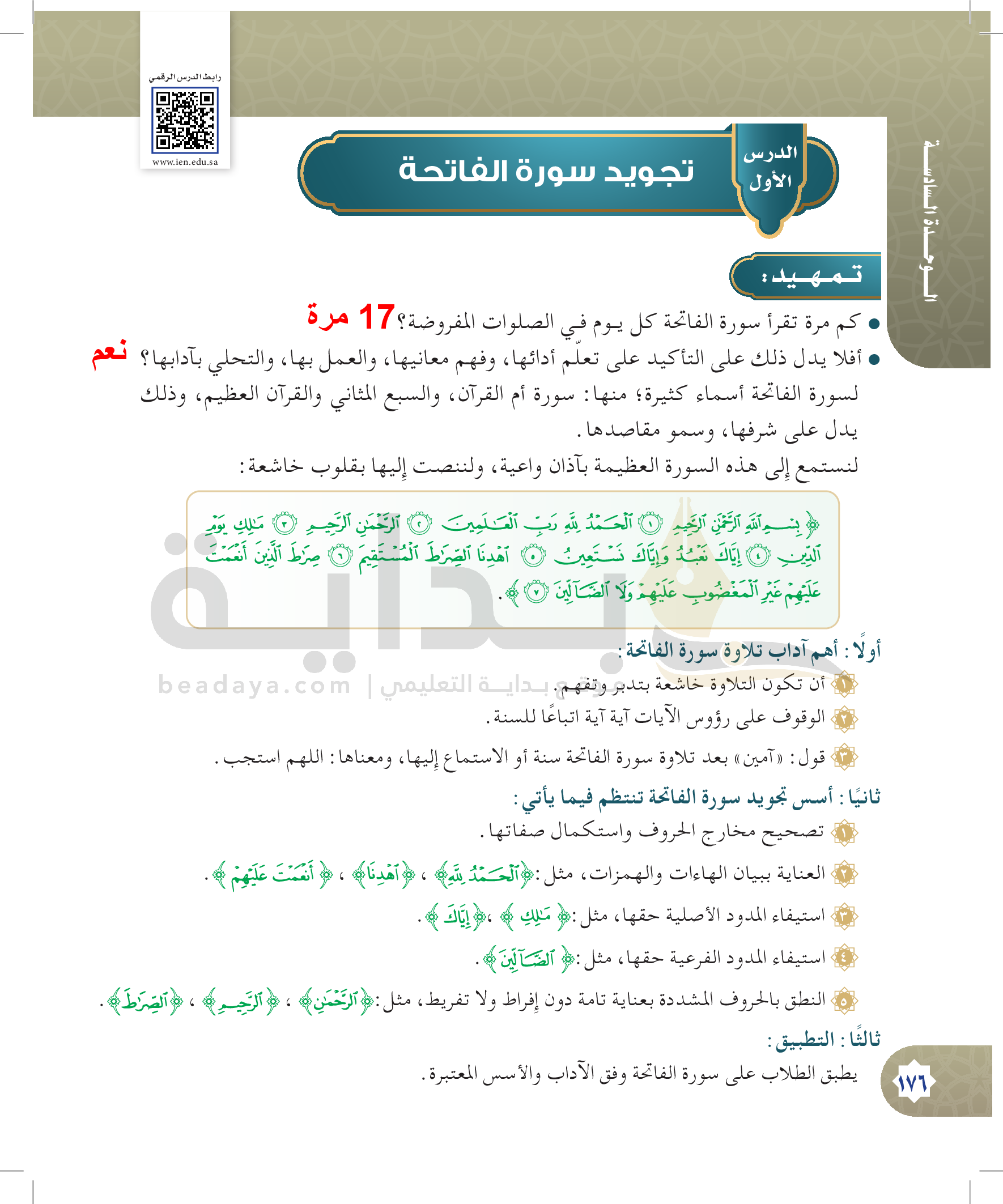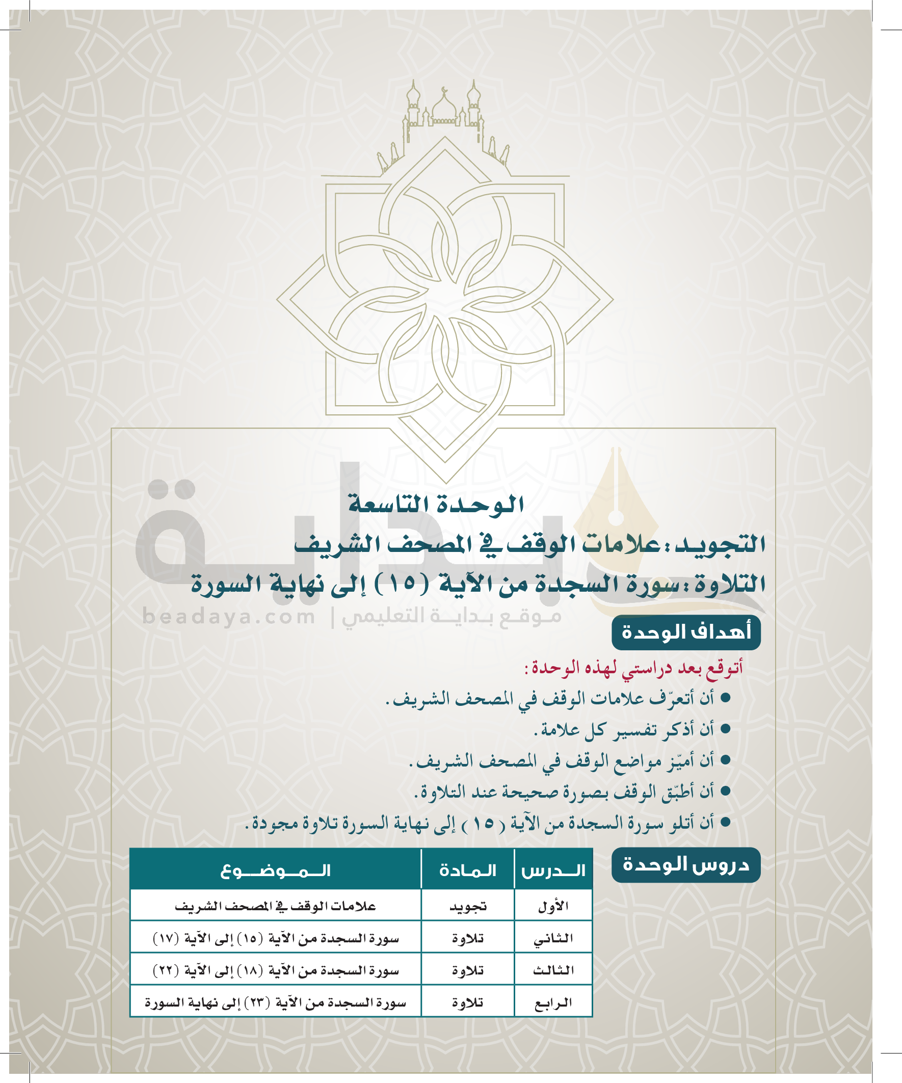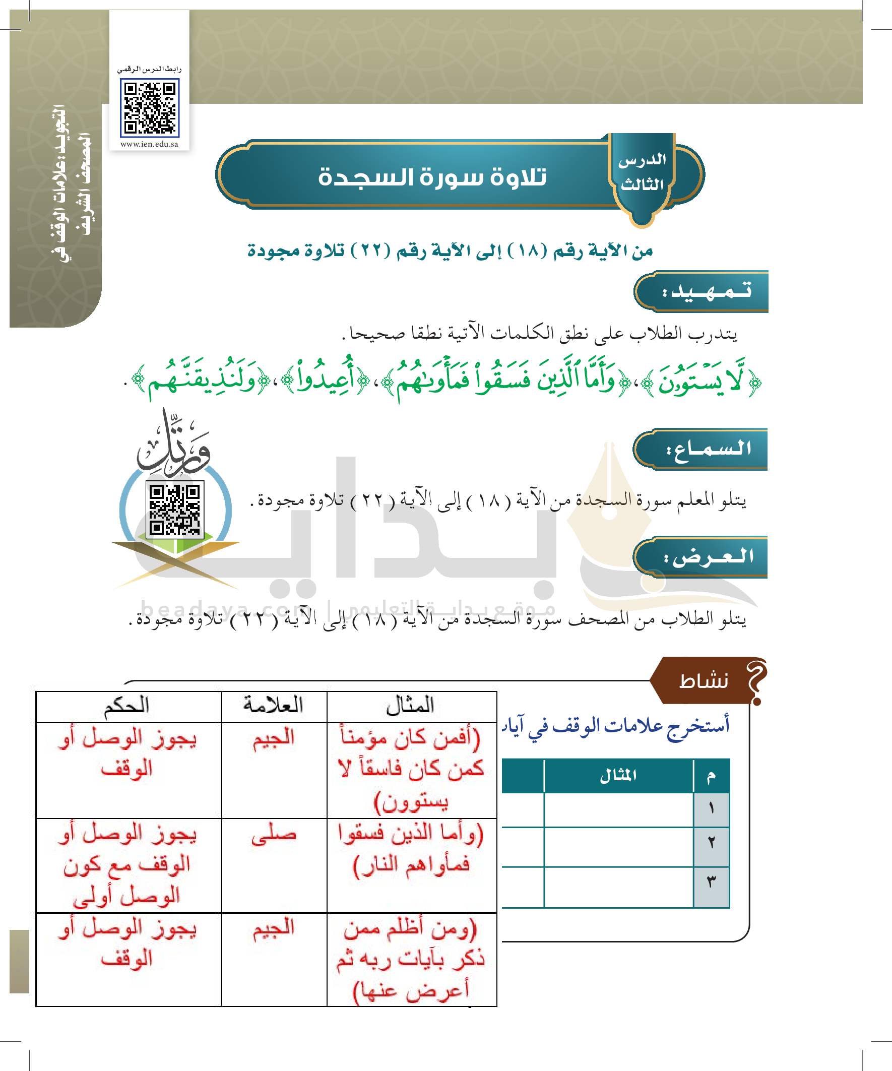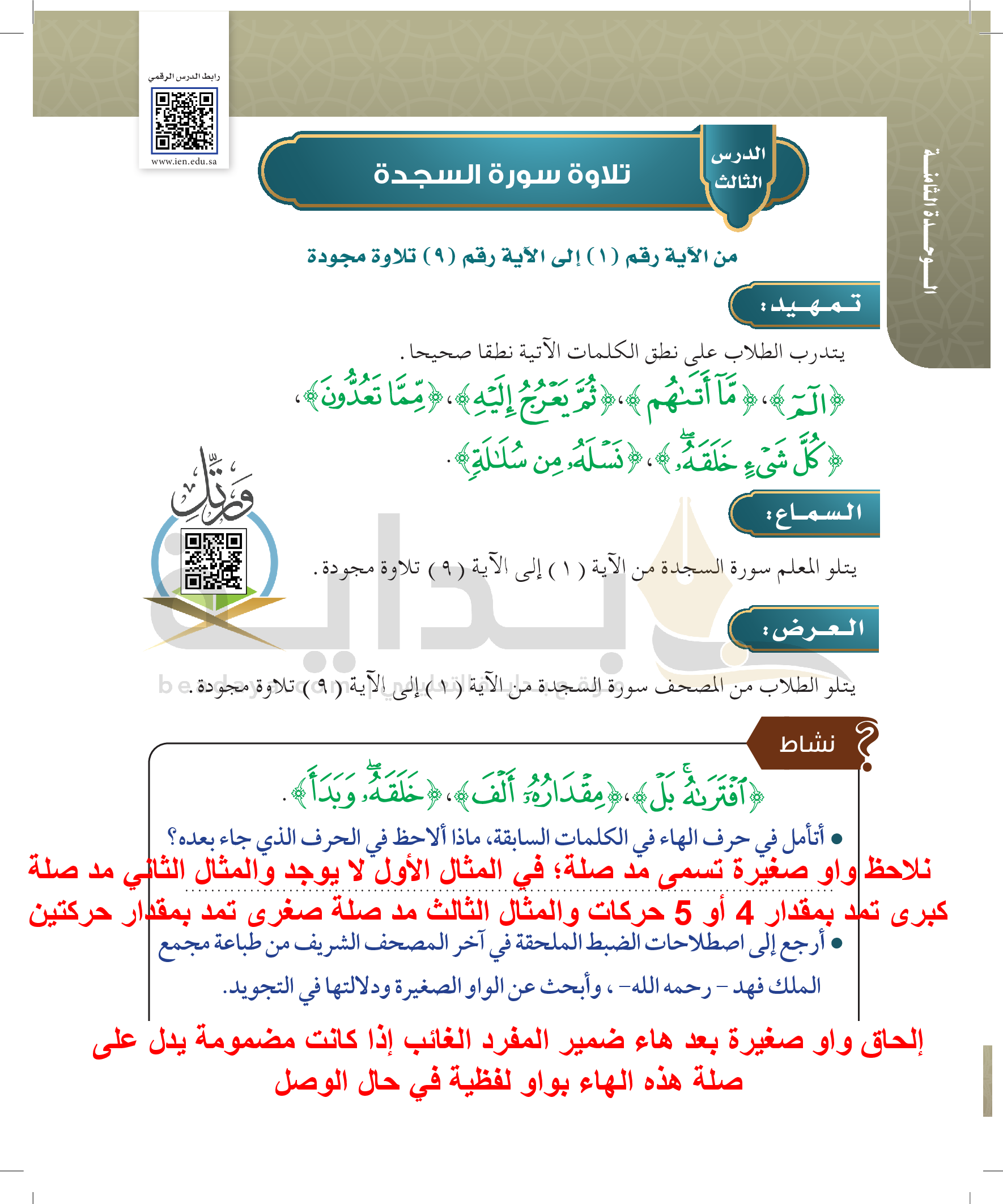 حل درس تلاوة سورة السجدة من الآية (1) الى الآية (9) تلاوة مجودة