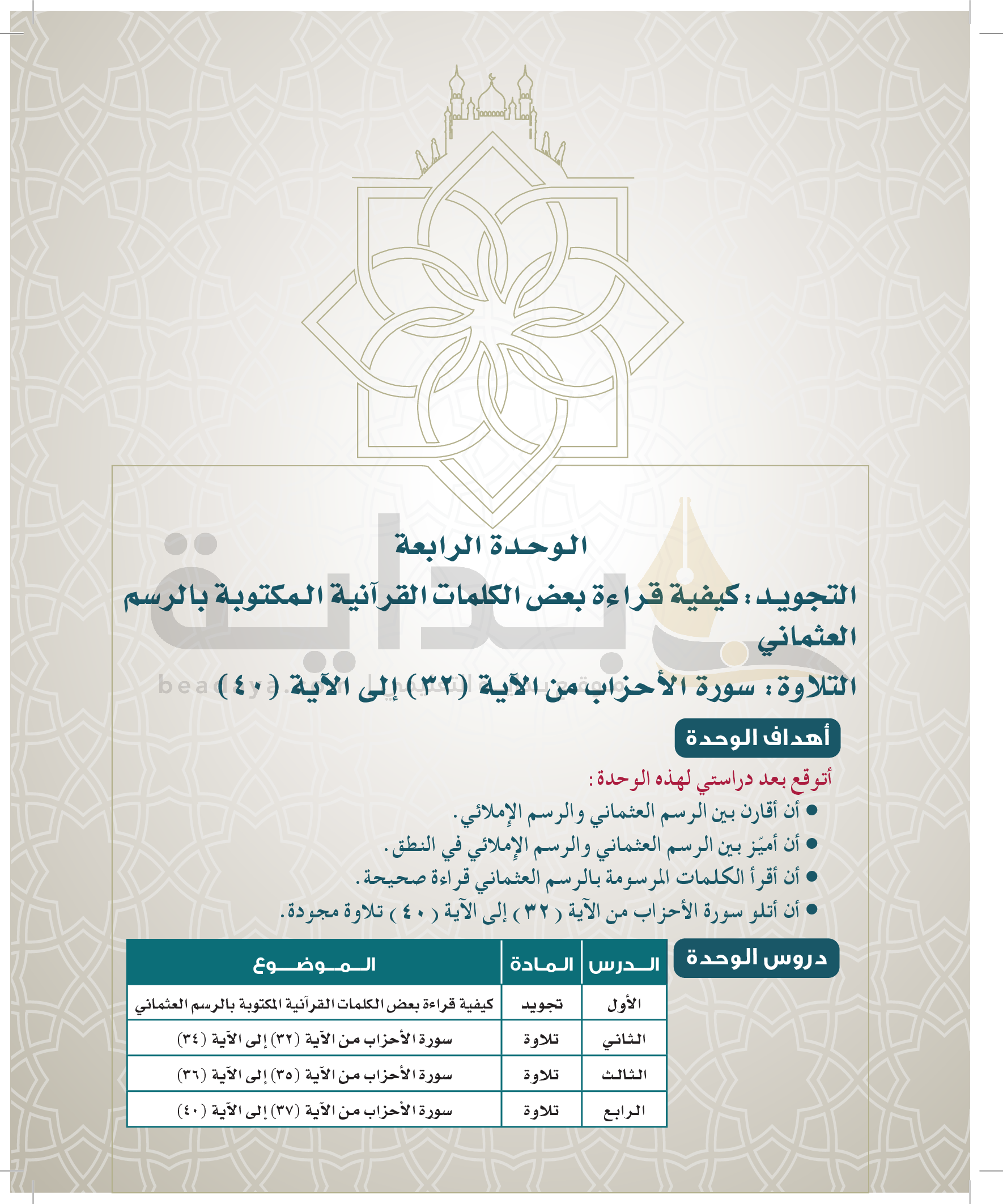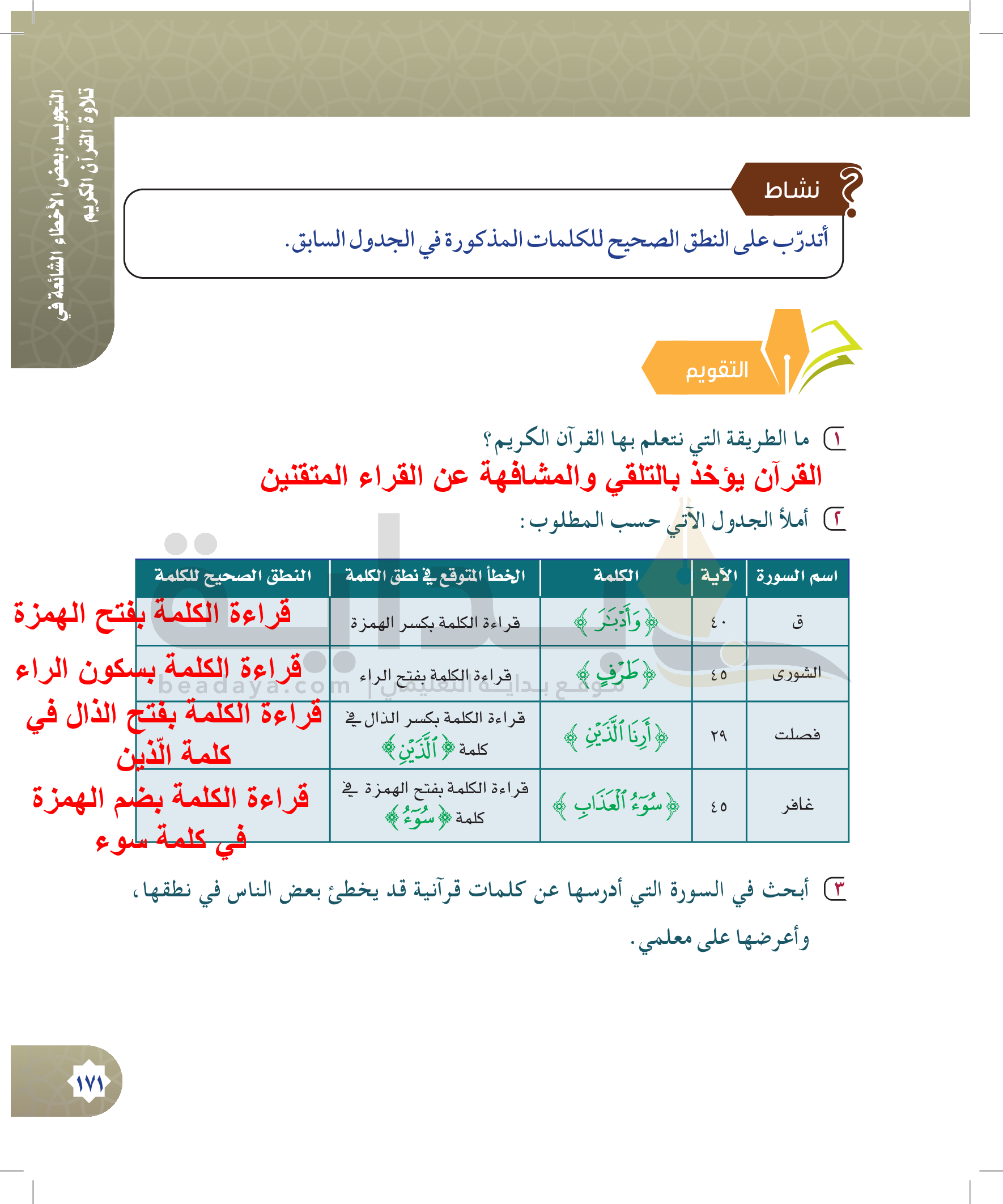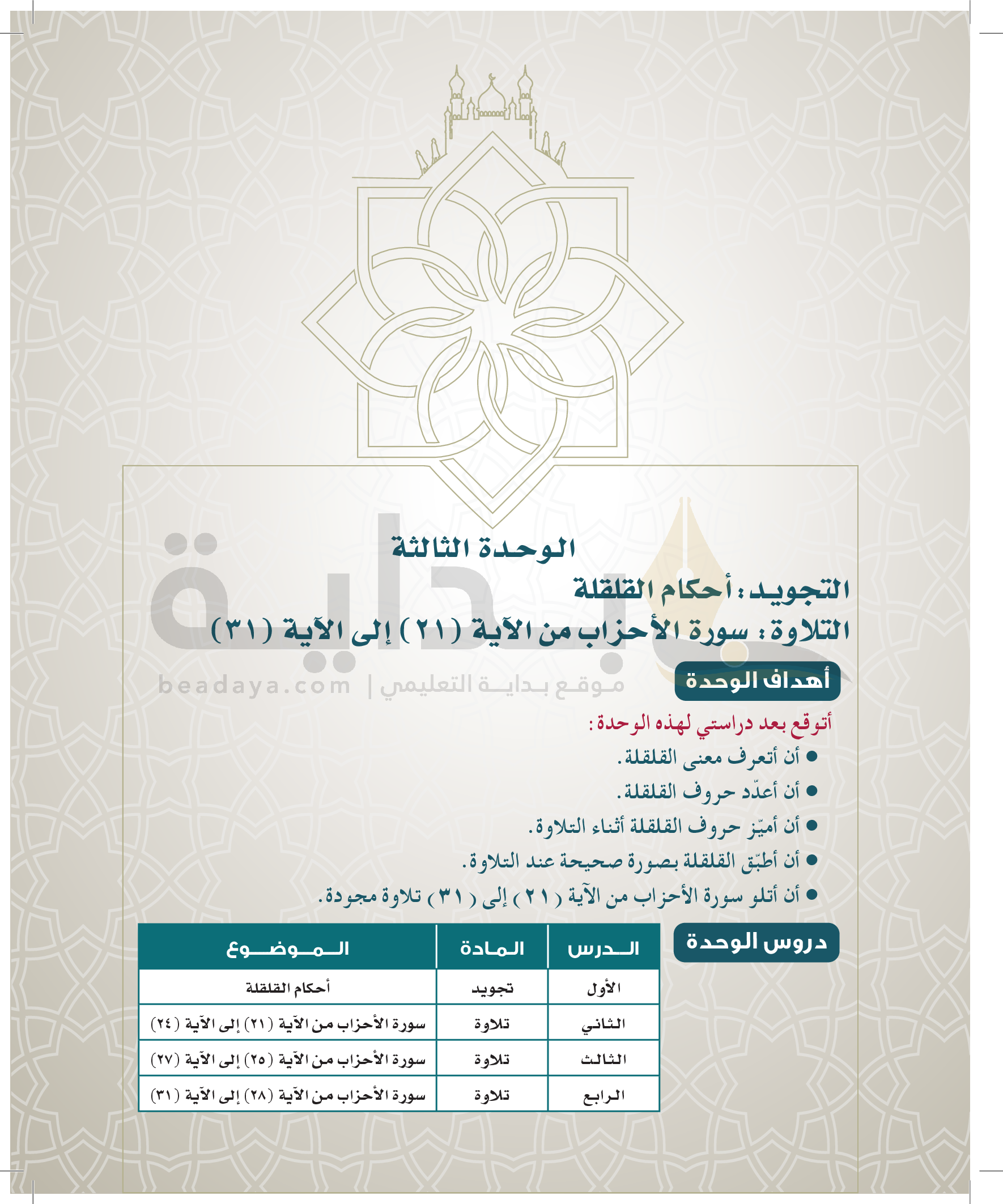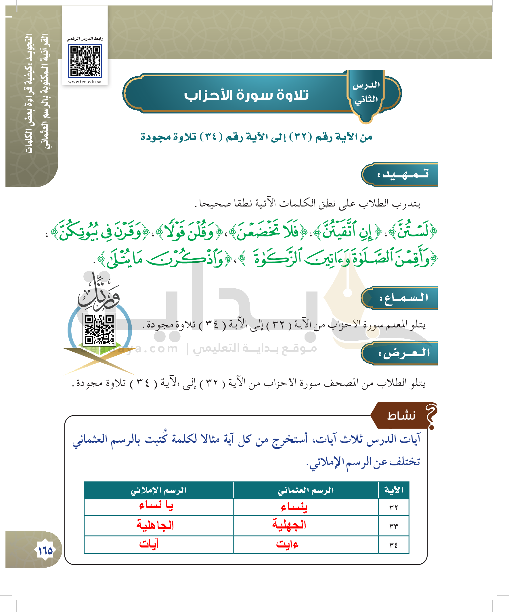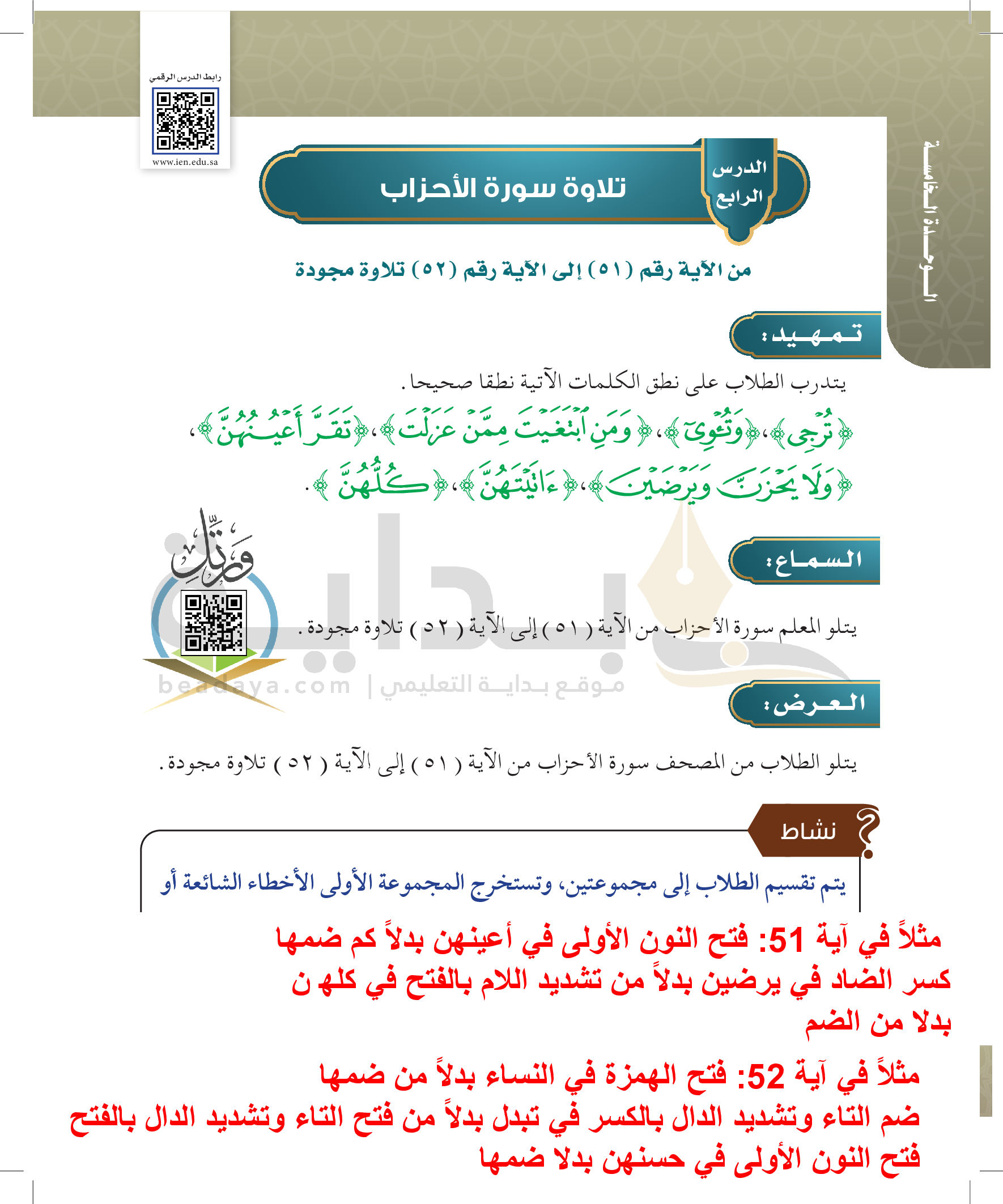 حل درس تلاوة سورة الأحزاب من الآية (32) الى الآية (34) تلاوة مجودة