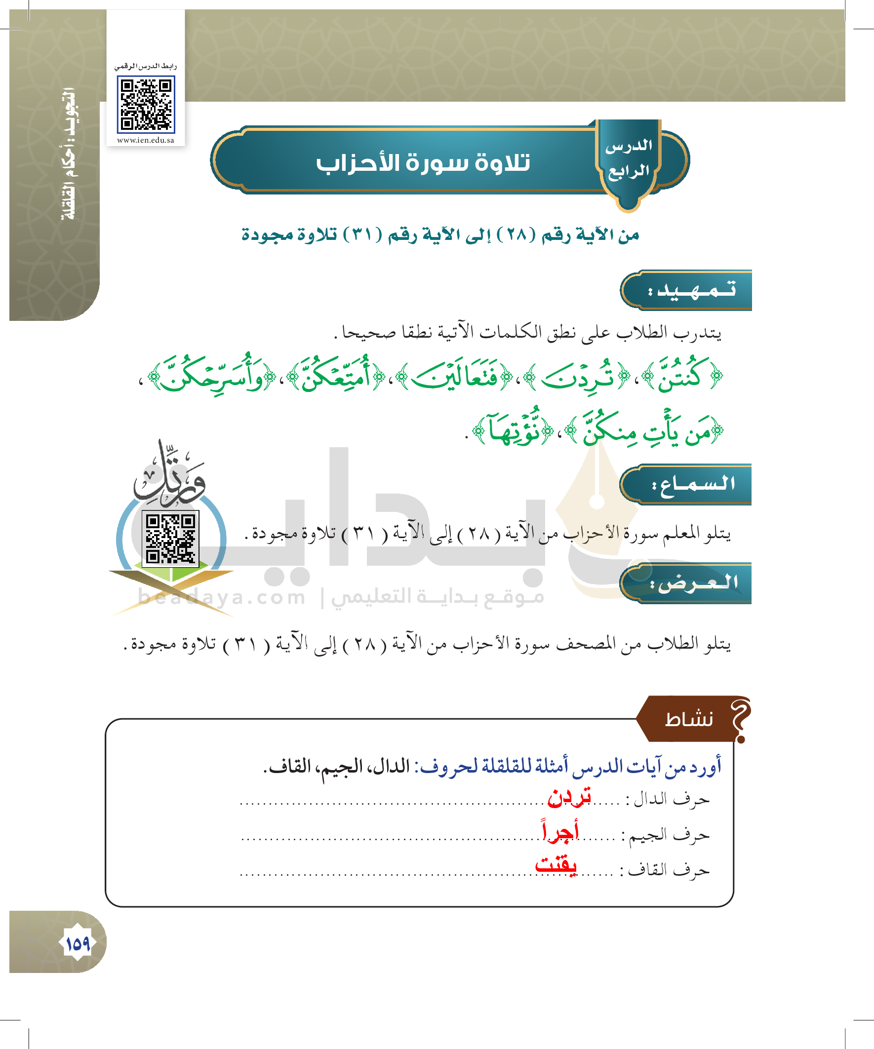 حل درس تلاوة سورة الأحزاب من الآية (28) الى الآية (31) تلاوة مجودة