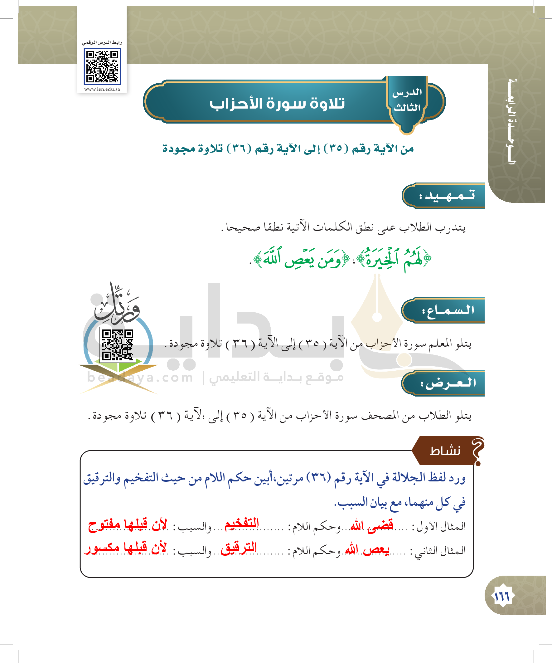 حل درس تلاوة سورة الأحزاب من الآية (35) الى الآية (36) تلاوة مجودة