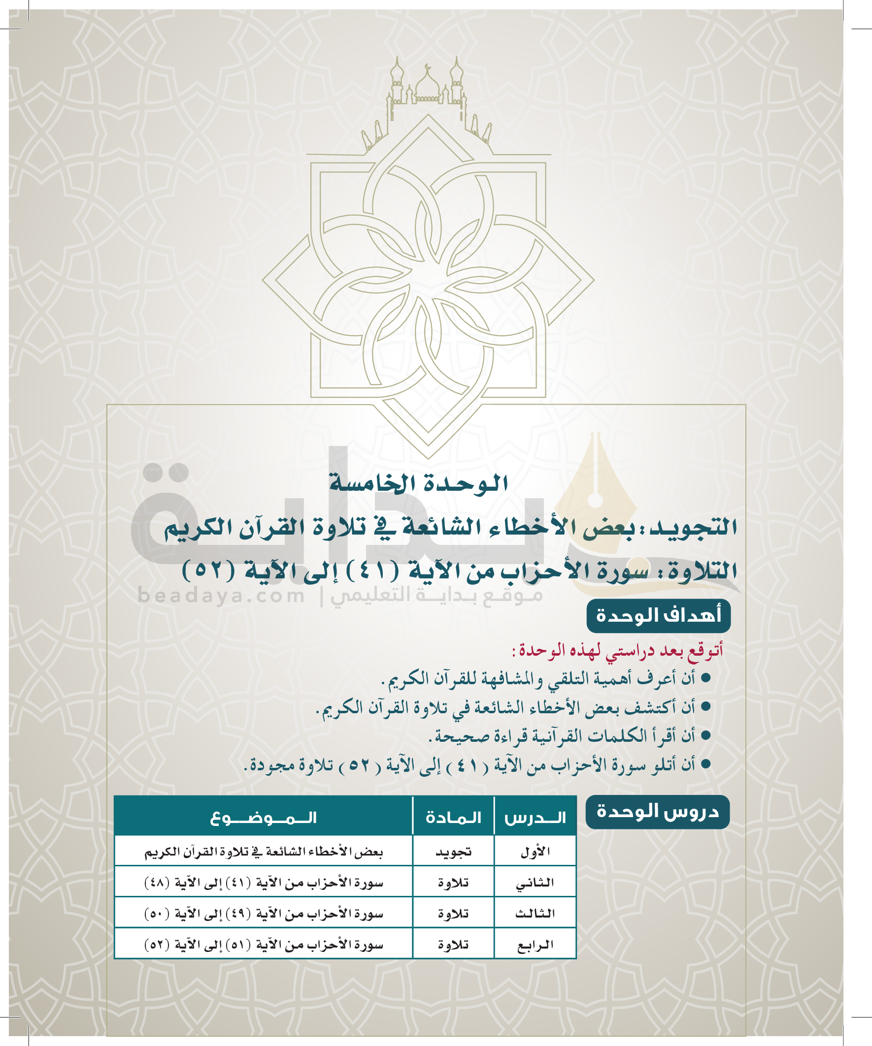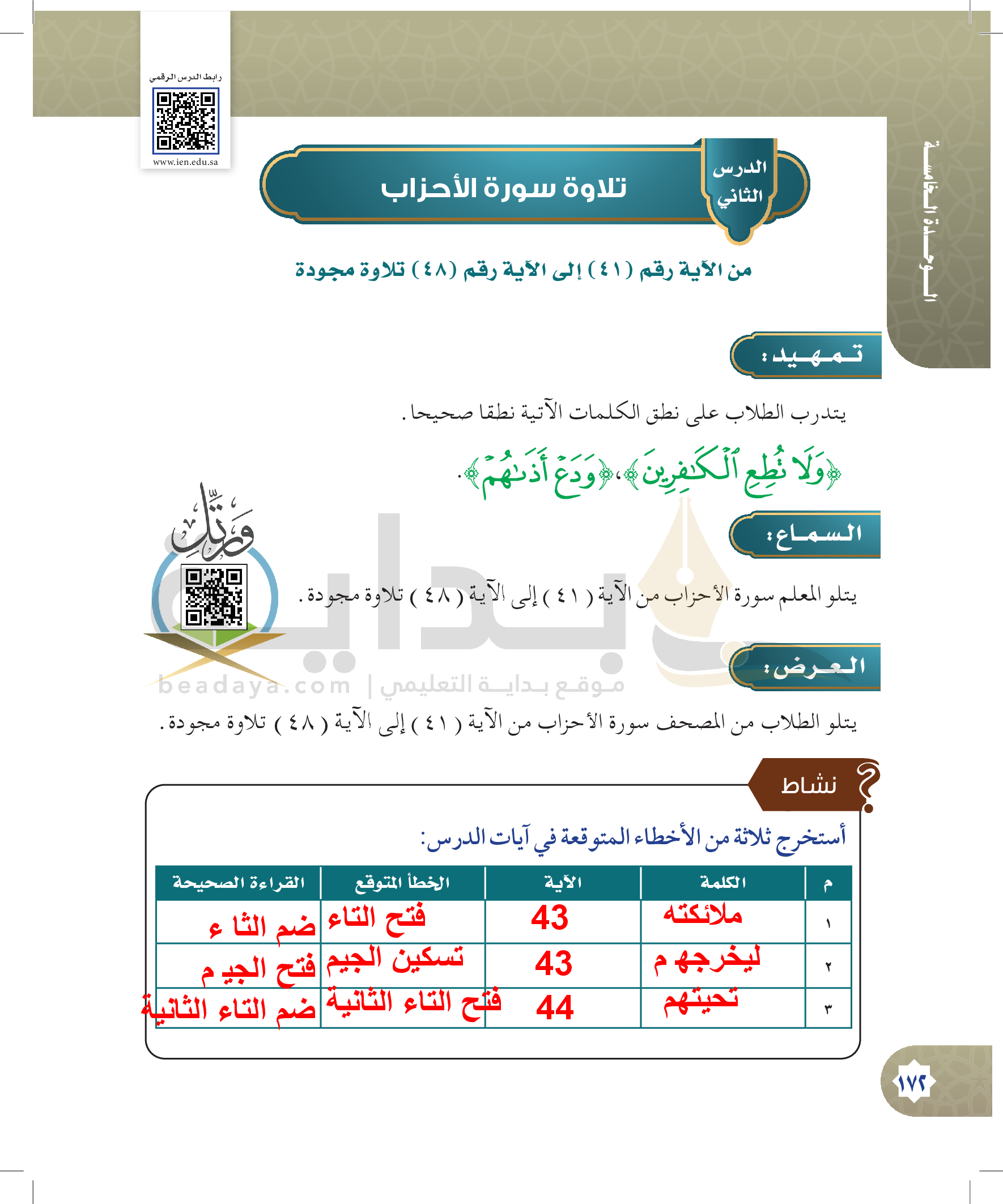 حل درس تلاوة سورة الأحزاب من الآية (41) الى الآية (48) تلاوة مجودة