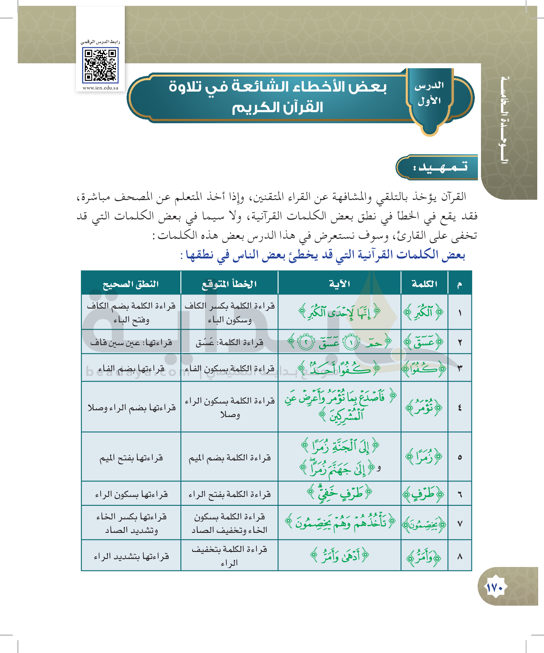 حل درس بعض الأخطاء الشائعة في تلاوة القرآن الكريم