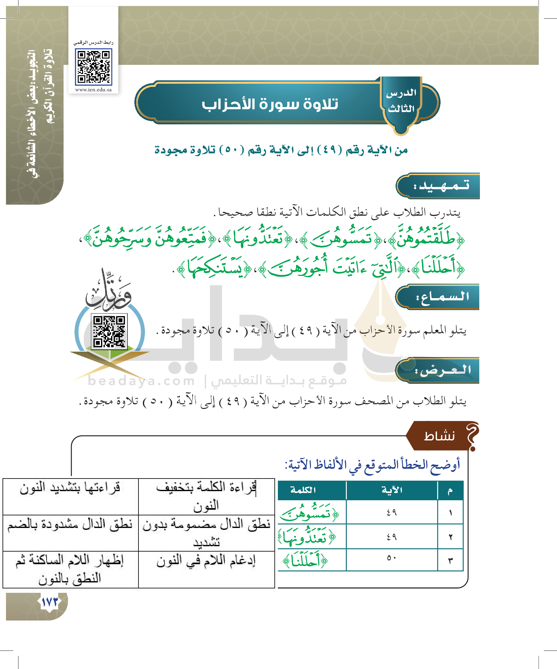 حل درس حل درس تلاوة سورة الأحزاب من الآية (49) الى الآية (50) تلاوة مجودة