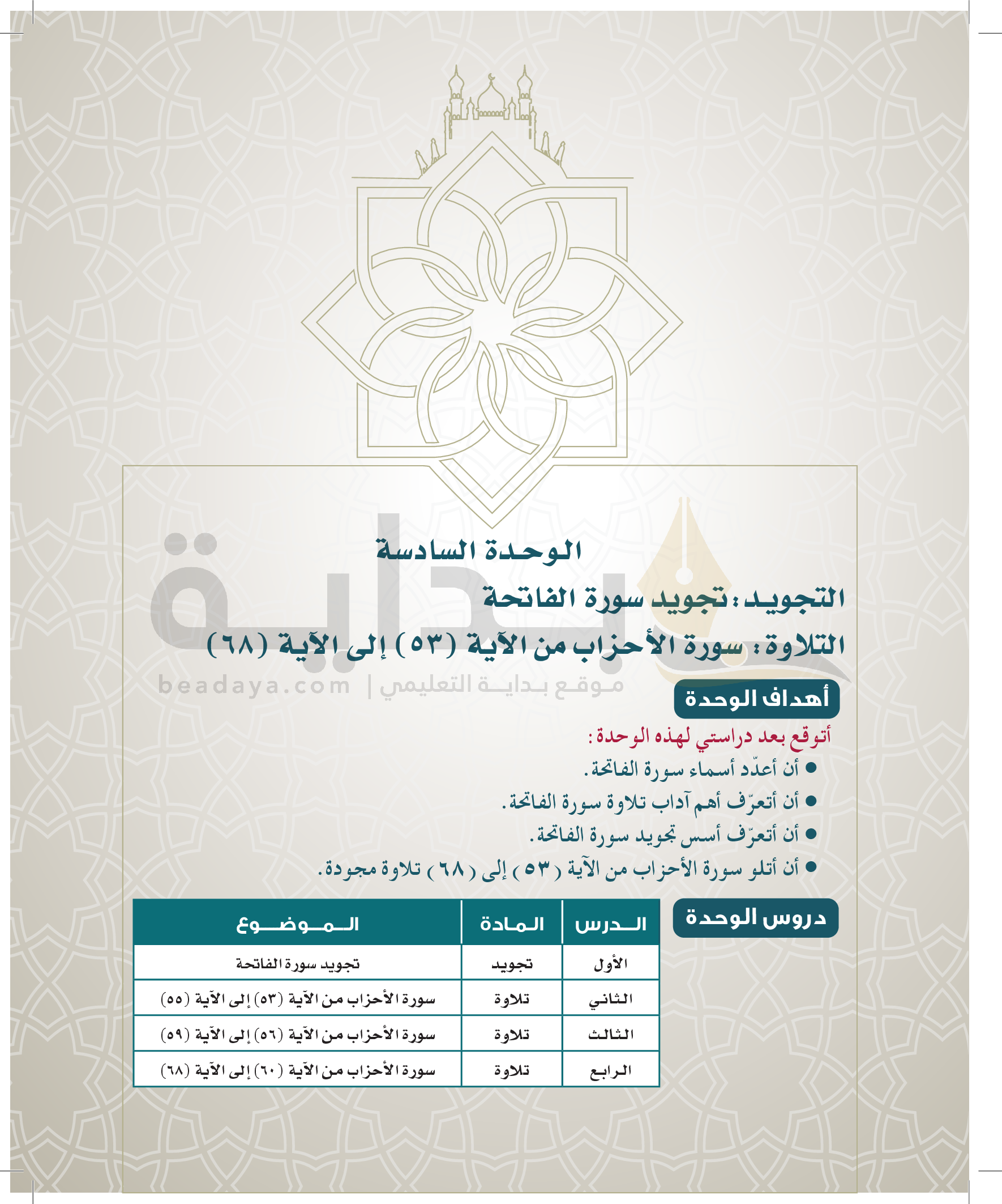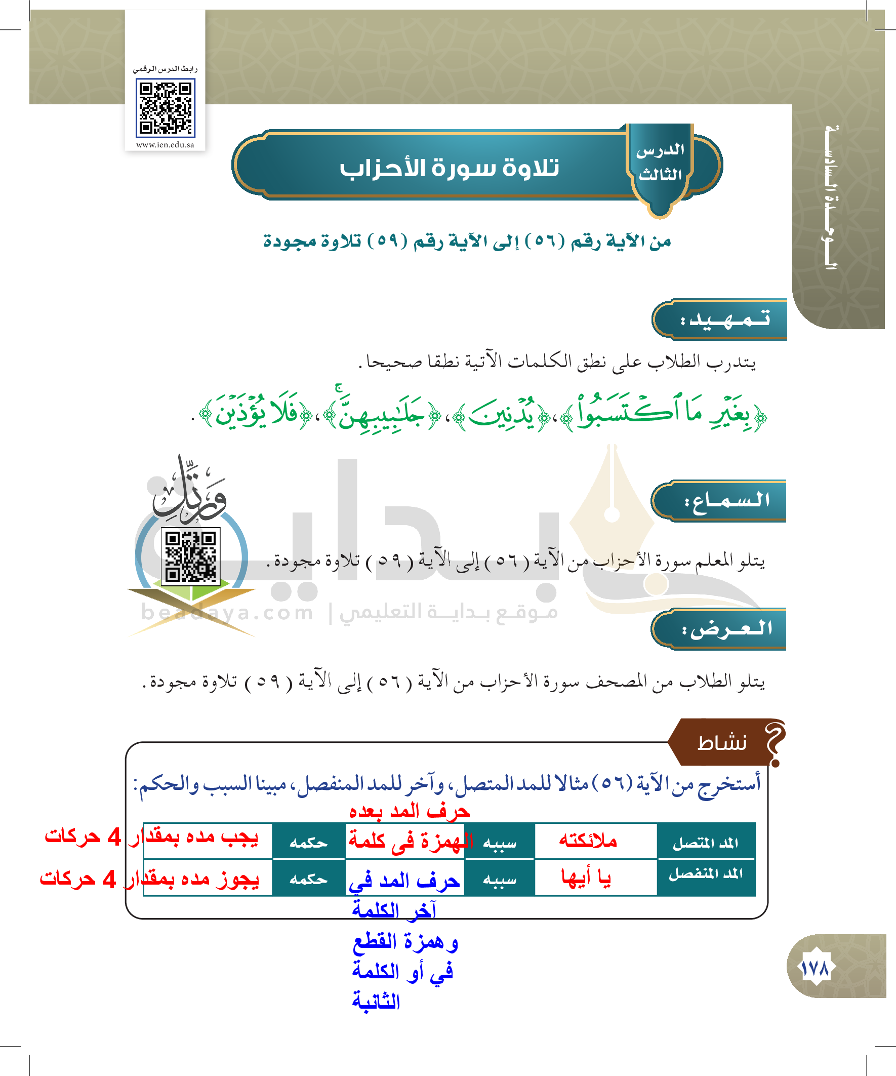 حل درس حل درس تلاوة سورة الأحزاب من الآية (56) الى الآية (59) تلاوة مجودة