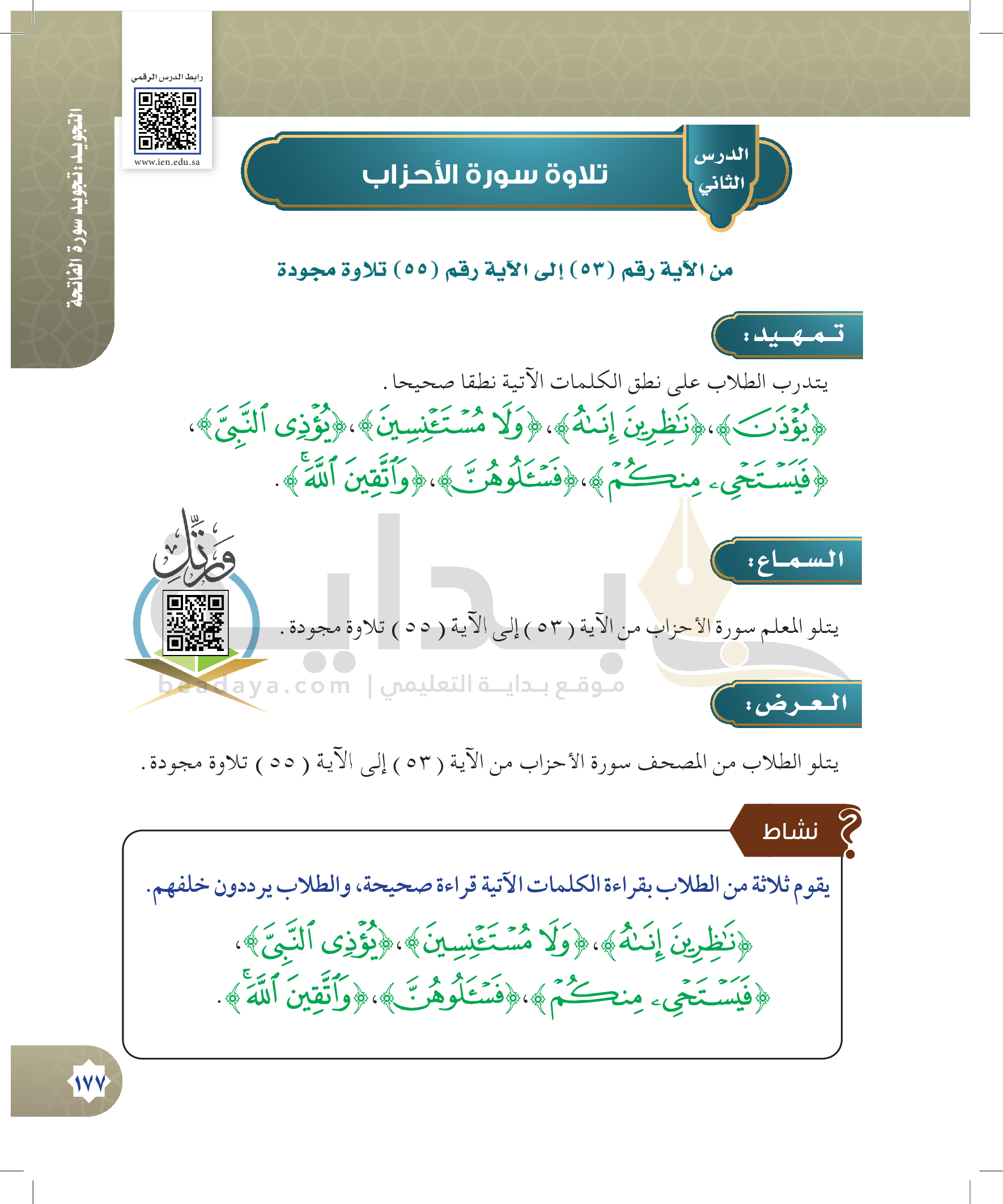 حل درس حل درس تلاوة سورة الأحزاب من الآية (53) الى الآية (55) تلاوة مجودة