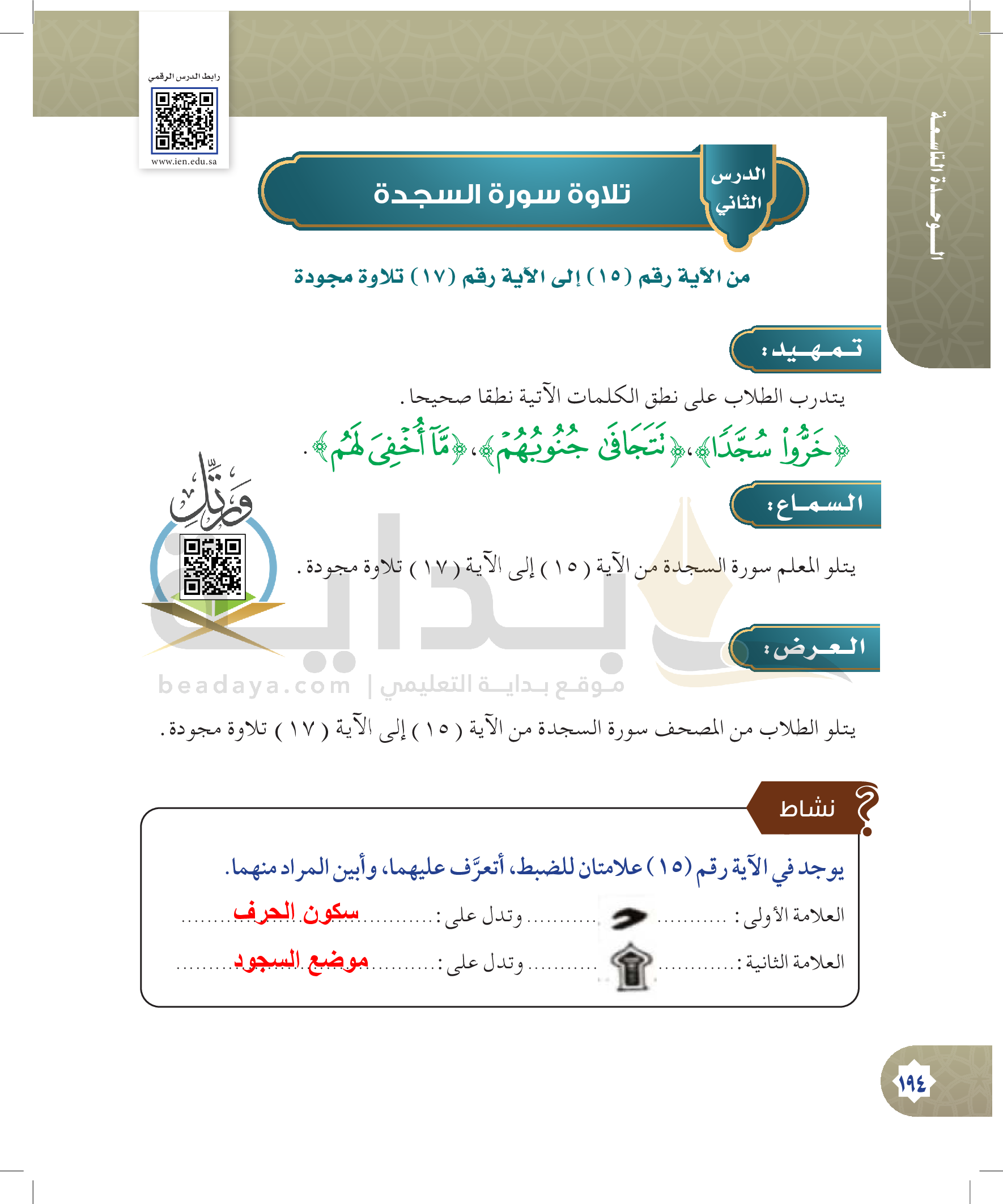 حل درس تلاوة سورة السجدة من الآية (15) الى الآية (17) تلاوة مجودة