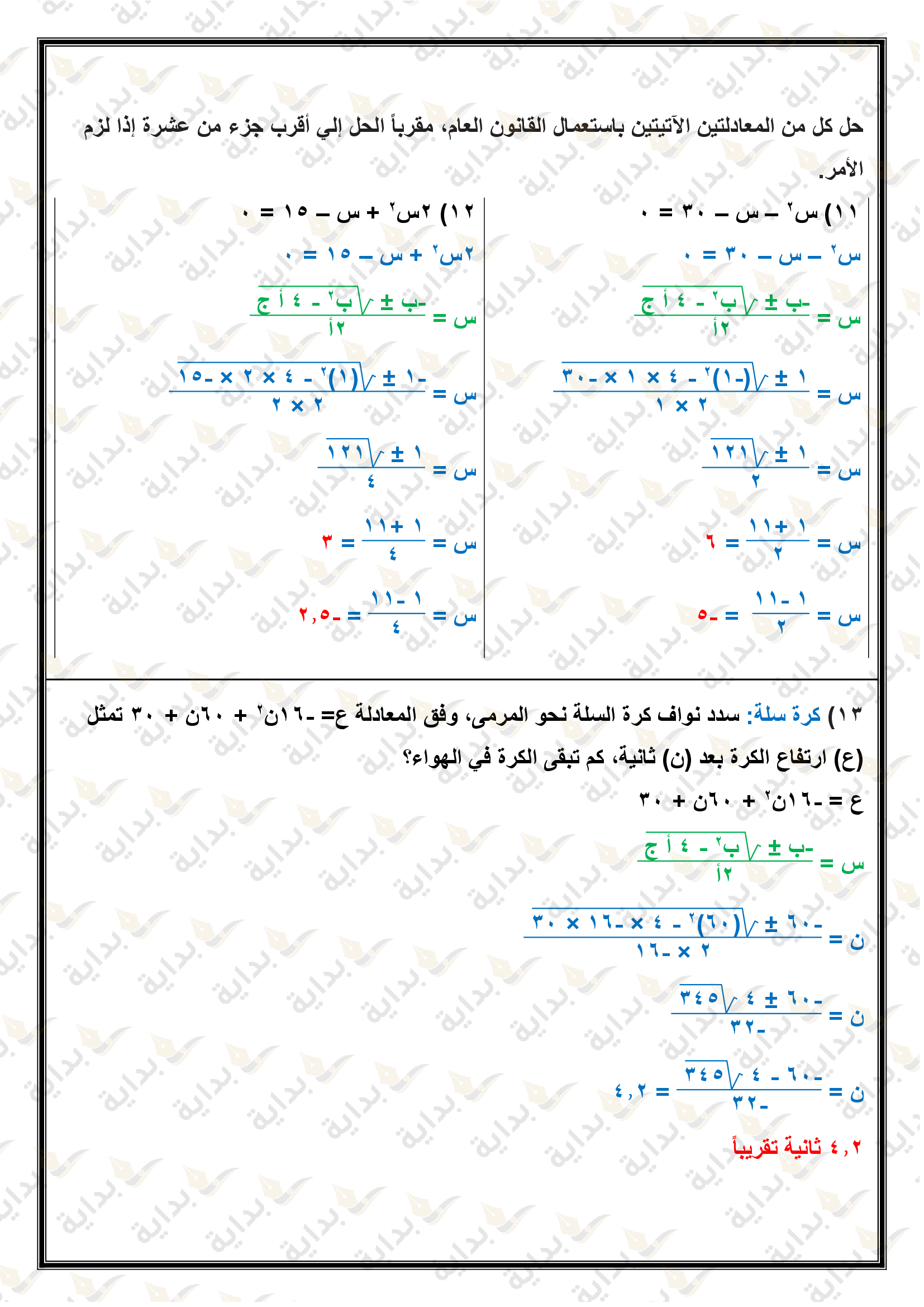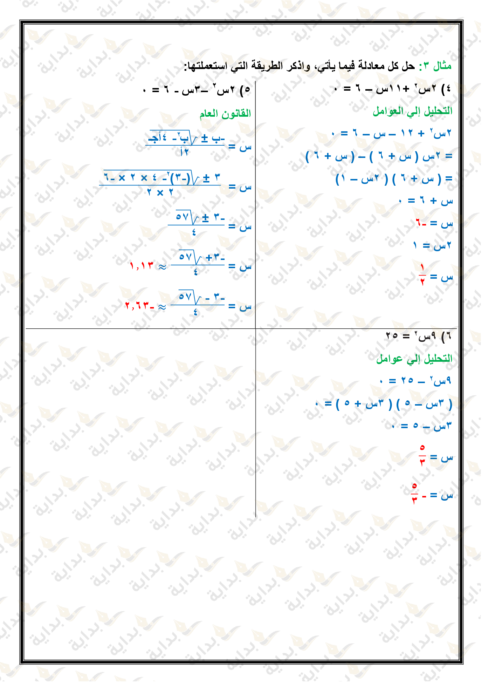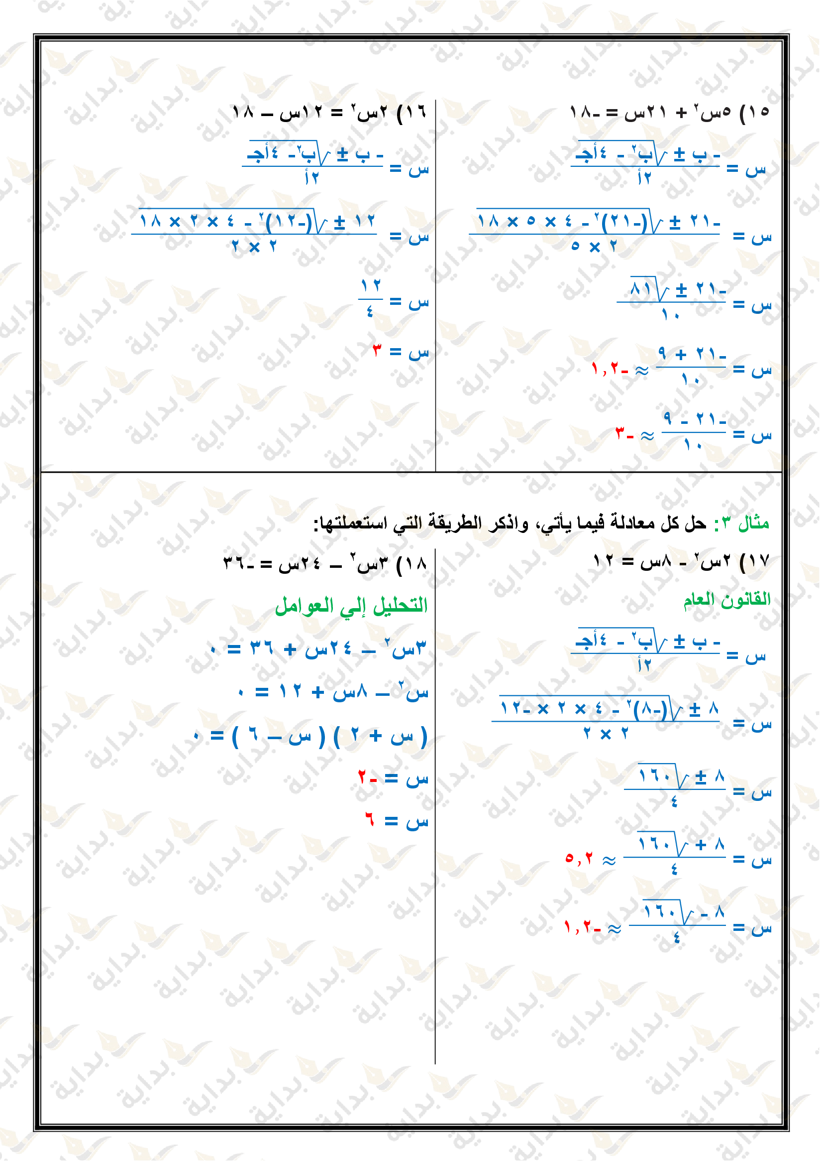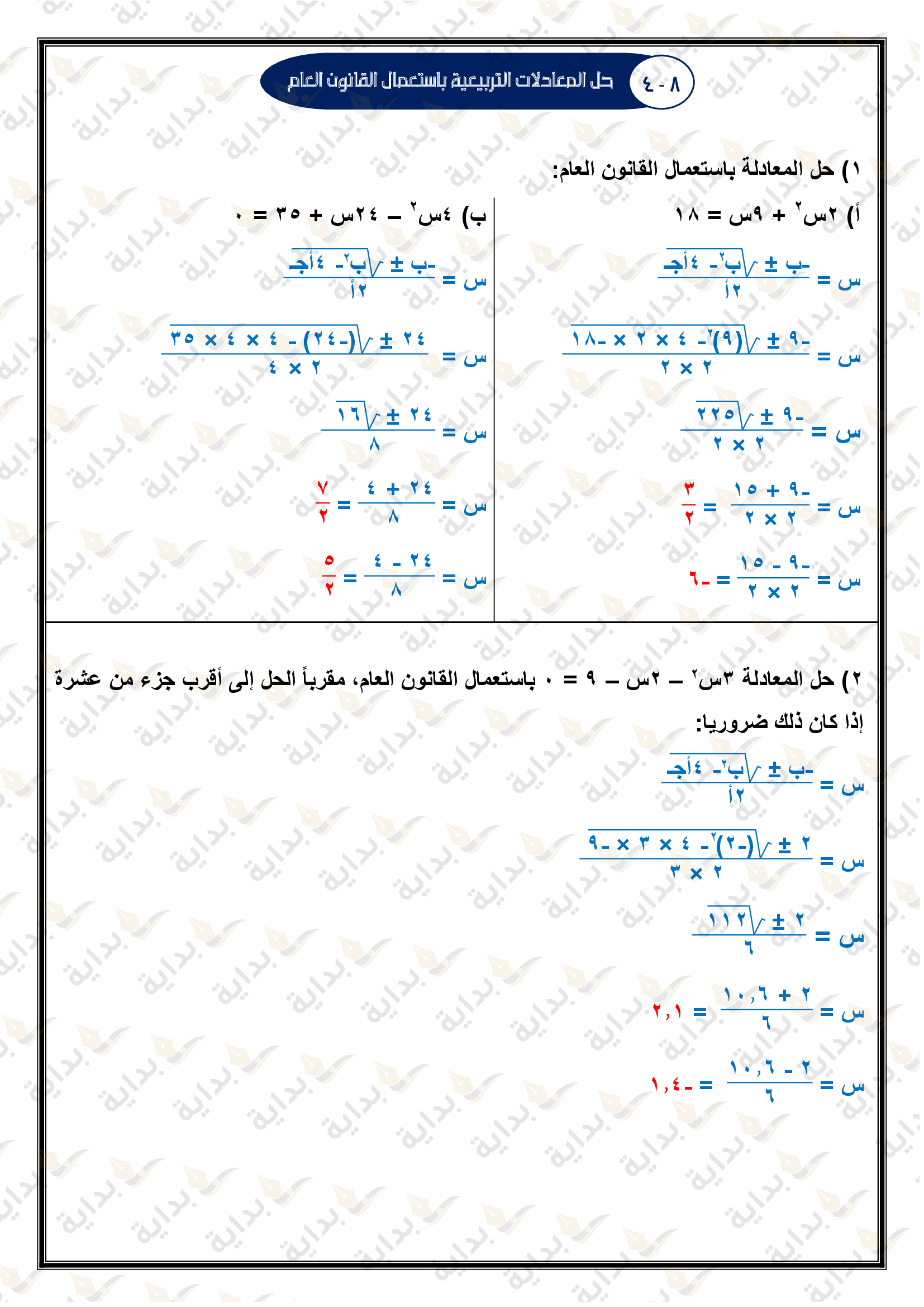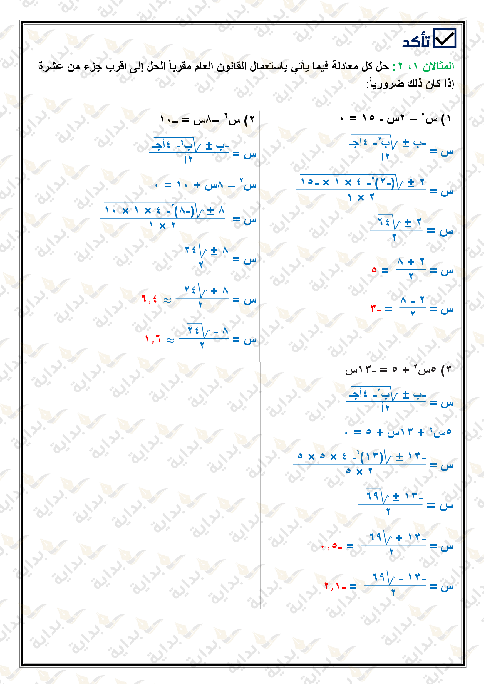 حل المعادلات التربيعية باستعمال القانون العام