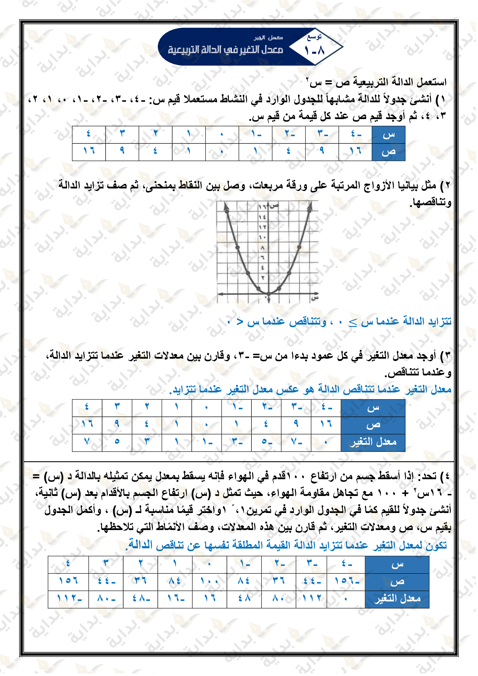 معدل التغير في الدالة التربيعية
