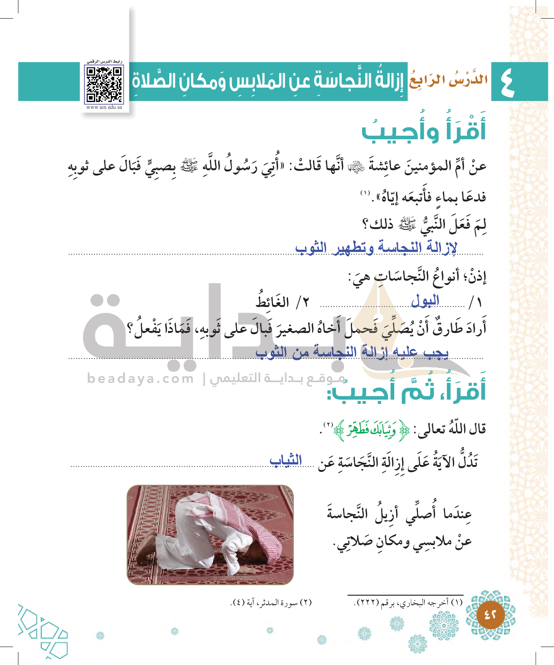الفقه - إزالة النجاسة عن الملابس ومكان الصلاة