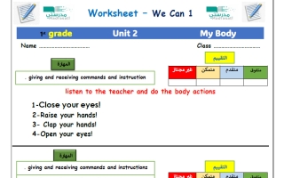 ورق عمل الوحدة الثانية لغة انجليزية الصف الأول الابتدائي الفصل الأول