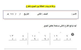 ورقة تدريبات (العلاقة بين الجمع والطرح) رياضيات الصف الثاني الابتدائي الفصل الأول