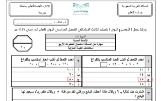 ورقة عمل للأسبوع الثاني رياضيات الصف الثالث الفصل الأول