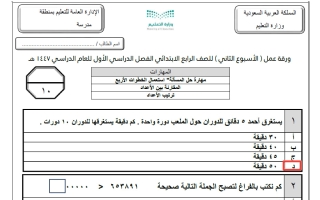 أوراق عمل رياضيات رابع ابتدائي فصل أول نموذج 2