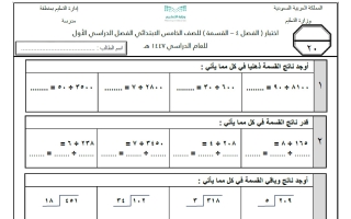 اختبار فصل القسمة رياضيات الصف الخامس الابتدائي الفصل الأول