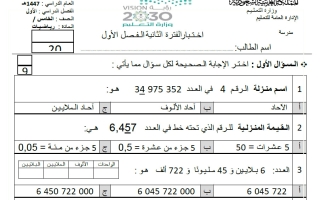 اختبار الفترة الثانية رياضيات الصف الخامس الابتدائي الفصل الأول