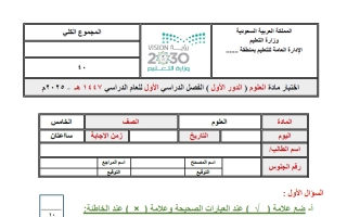 اختبار نهائي علوم غير محلول خامس ابتدائي الفصل الأول أ. سكره الشمري