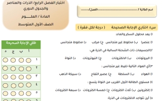 اختبار فصل (الذرات والعناصر والجدول الدوري) علوم الصف الأول المتوسط الفصل الأول