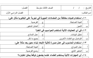 اختبارات مهارات علوم محلول ثالث متوسط الفصل الأول
