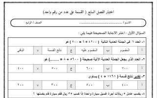 اختبار فصل القسمة على عدد من رقم واحد رياضيات الصف الرابع الابتدائي الفصل الثاني